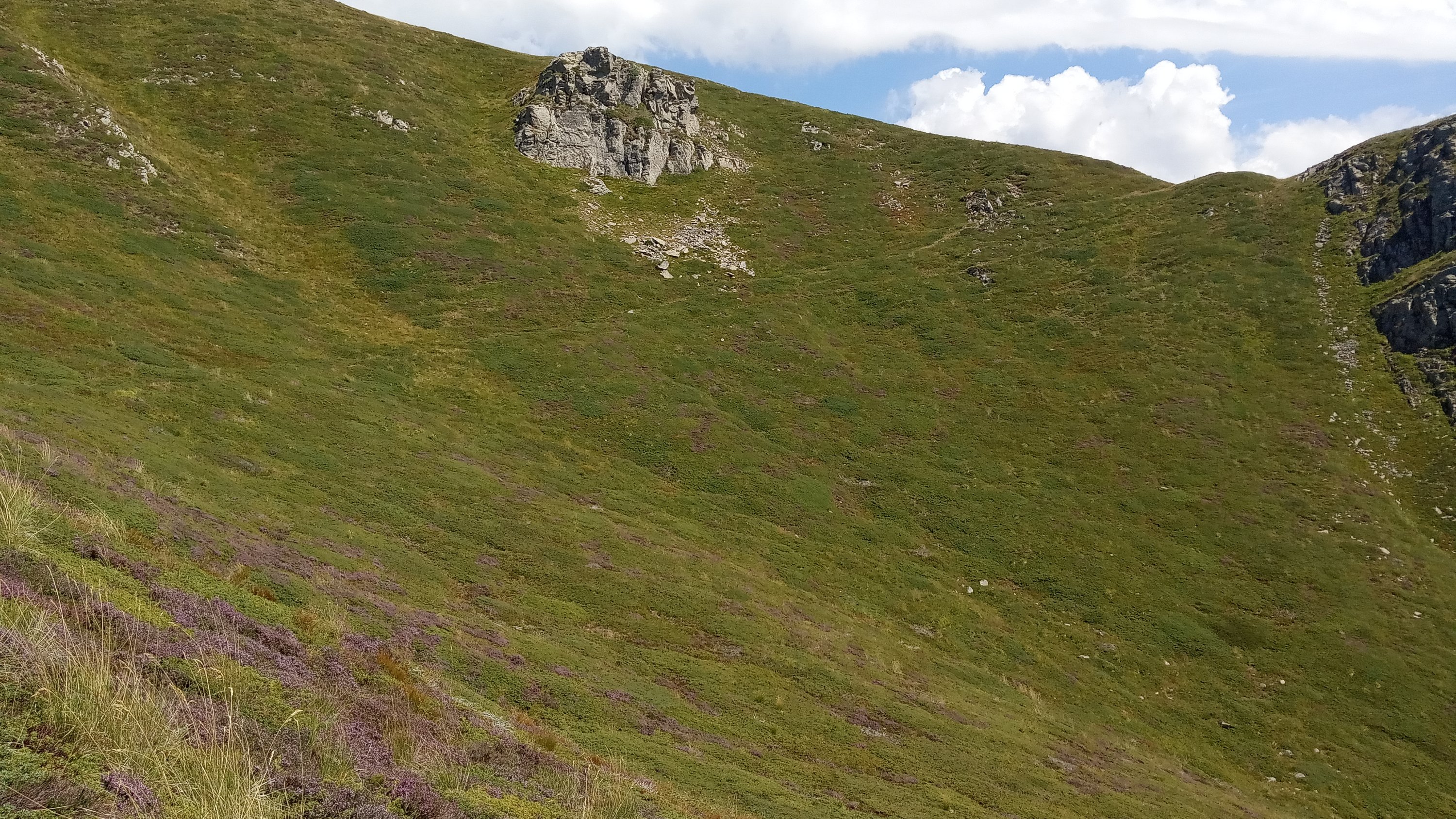 Uscendo dal bosco, sul sentiero CAI 64 verso il Monte Vecchio, s’incontrano grandi distese erbose. Le cime attorno sono morbide ma il declivio per raggiungerle è comunque ripido e la meta finale non fa eccezione, ma io questo ancora non lo so perché si trova di là da quella sella. Il sentiero taglia come una cicatrice le pendici; credo anche che con l’innevamento il percorso divenga particolarmente insidioso, so di incidenti accaduti lì.