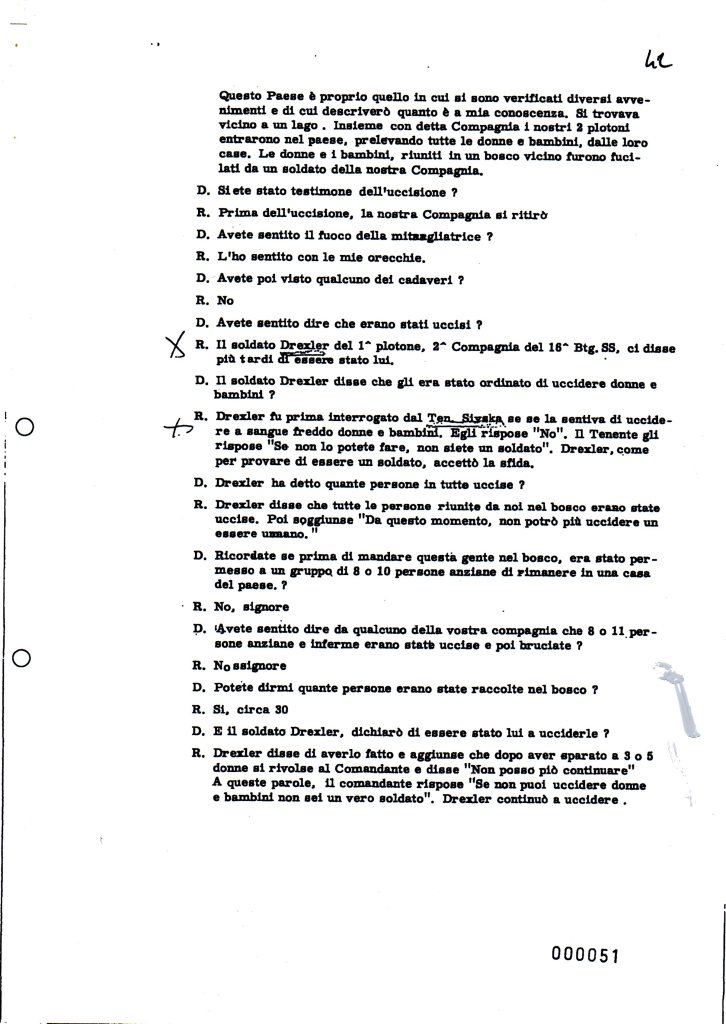 Dalla testimonianza di Josef Lambert Diederiche, 3a Compagnia, 16° battaglione di ricognizione SS, prigioniero di guerra, interrogato dal Magg. Milton R. Wexler, 5a Armata USA, Commissione Crimini di guerra, il 18 ottobre 1944.