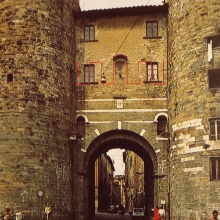 A conferma di questa lettura dell’elevato, in tempi recenti un forte acquazzone ha bagnato la facciata della porta e i diversi materiali retrostanti l’intonaco si sono scaldati e asciugati in tempi diversi al sole. Lo scatto fortunato delle ultime due immagini mostra in tutta chiarezza l’antico disegno dei merli delle mura medievali di Lucca.