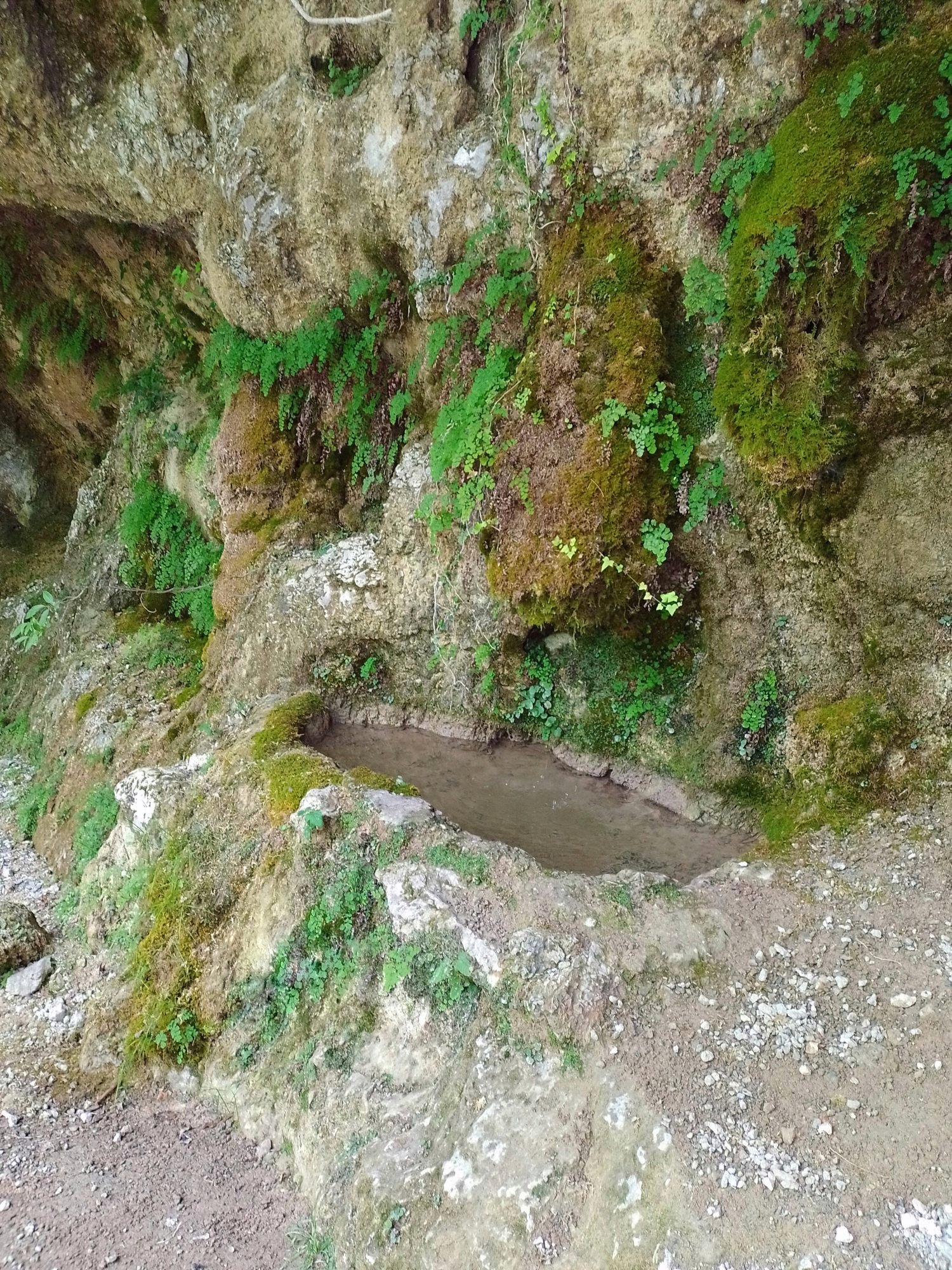 Poco oltre, sempre sul versante a monte si apre una seconda serie di grotte naturali, il cui utilizzo umano è evidente. Sono sempre restio a utilizzare aggettivi tali da indurre facili suggestioni ma veramente quello slargo ha qualche potere che sfugge alla comprensione razionale. La parete rocciosa è perforata da numero aperture di varia dimensione e su più livelli, alcune sono ormai completamente fossili ma in altre sezioni l’acqua svolge ancora la sua vitale funzione modellatrice e rigeneratrice. Frescura e verdura appaiono evidenti e nel silenzio irreale di quel giorno fin da diversi metri di distanza di percepiva echeggiante il cristallino gocciolare all’interno di una vasca di origine naturale e poi adattata dalla mano dell’uomo per farne un abbeveratoio per gli animali.