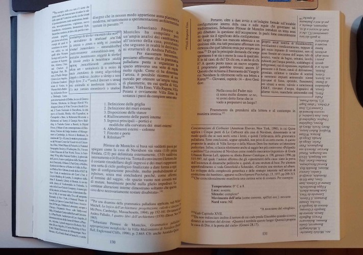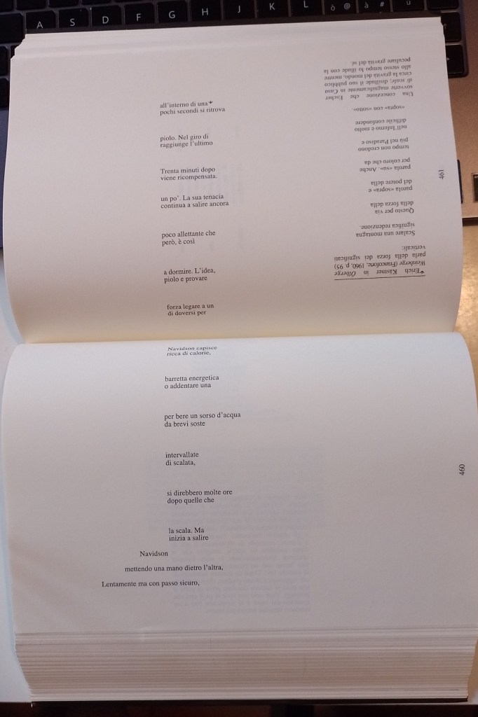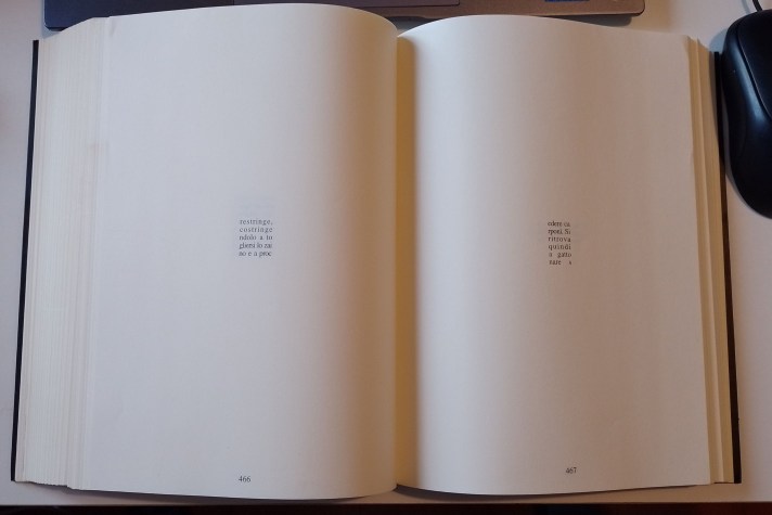 Per concludere, due parole sull’impaginazione. Vi ho già spiegato la presenza di layout multipli ma non è tutto: non esiste una pagina uguale all’altra. Spesso l’impaginazione segue la logica – se di logica si può parlare – del contenuto. Ho già accennato alle righe sottosopra, ma quello è il meno: ad un certo momento della sua quarta esplorazione Navidson si addentra in un cunicolo che si restringe passo dopo passo e quindi lo specchio di scrittura è sempre più piccolo fino a diventare un minuscolo quadratino al centro di una enorme pagina completamente bianca. Oppure, dopo aver letto più o meno normalmente (più o meno, insisto) apprendiamo che Navidson inizia a salire una scala a pioli allora, fedelmente, il testo andrà letto ruotando di 90° libro leggendo dal basso verso l’alto le righe che a due a due imitano i pioli della scala. Ci ho messo un po’ a capirlo!