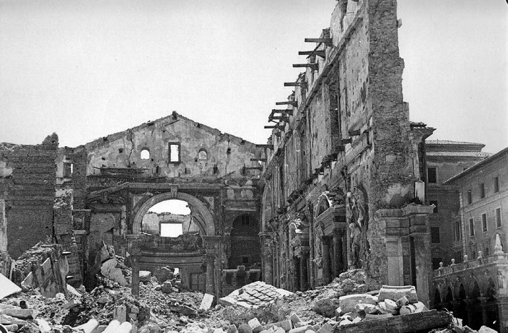 Il 15 febbraio del 1944 il monastero benedettino di Cassino fu raso al suolo; per miracolo archivio e biblioteca erano stati tratti in salvo ma del luogo non rimase che polvere. A Firenze, di fronte all’avanzata sempre più decisa dei nemici, i tedeschi fecero saltare tutti i ponti della città con l’eccezione di Ponte Vecchio ma per renderlo inaccessibile furono rasi al suolo i quartieri ai due lati del ponte, ingombrando la strada con montagne di macerie.