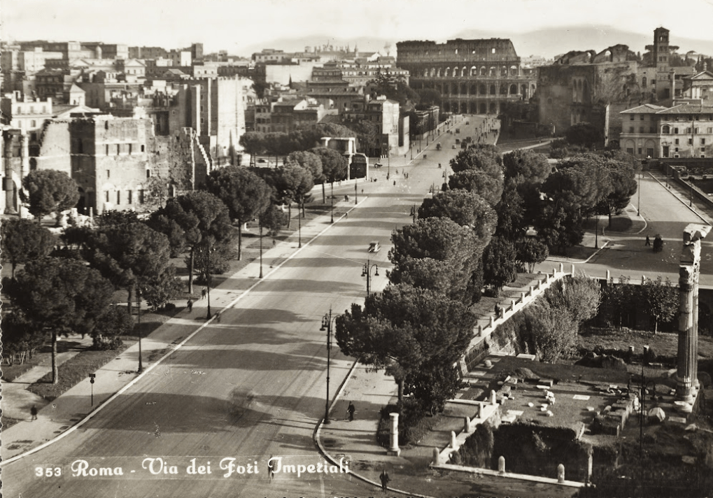 Nel Novecento, come tutti ahimè sappiamo, il 10 giugno del 1940 Mussolini annunciò che l’Italia era entrata in guerra. Già da tempo il duce vagheggiava sogni imperiali (e il re con lui); così sotto l’emblema del fascio littorio rinascevano i fasti di Roma antica e la stessa capitale veniva riprogettata per essere una degna erede del tempo dei cesari. In pieno centro storico si abbattevano i quartieri medievali (dov’era anche la casupola romana di Michelangelo) per tracciare dal Colosseo a Piazza Venezia via dei Fori Imperiali, grazie alla quale si potevano godere le rovine più monumentali di Roma ma in ottica moderna non senza compiere un danno irreparabile alla stratigrafia storica e archeologica.