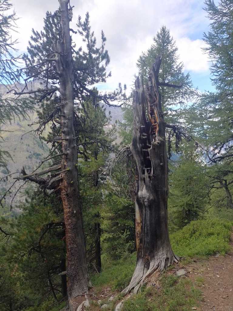Ad ogni modo la decisione è presa, scegliamo il sentiero 3: prima tappa, tra 2,8 km e 523 metri più su, il Casotto Parco Naturale del Gran Paradiso (2296 mt) n el Vallone di Le Sort. Guadagnamo metri in un bellissimo bosco di abeti rossi, su un tronco vediamo una fototrappola mimetizzata, mi domando quali frequentazioni vi siano la notte.