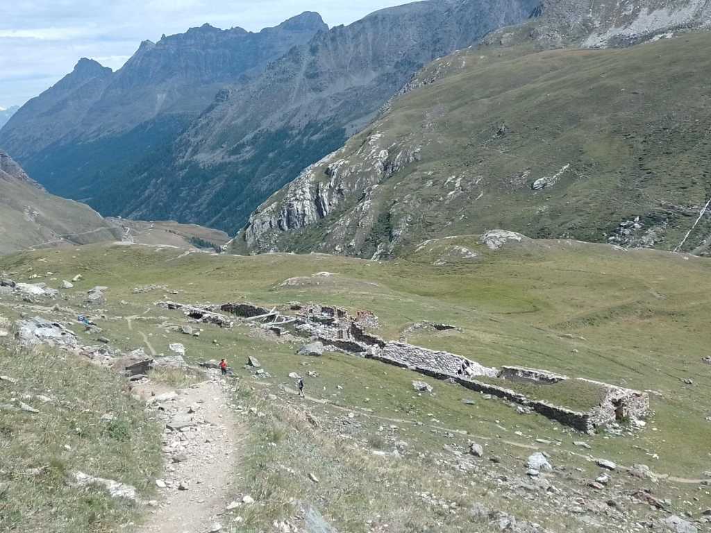 Prima due parole sull’alpeggio. Composto sostanzialmente da due edifici con piccoli annessi, non ho potuto non ammirarne l’architettura. I due corpi principali erano coperti con una volta in pietra sulla quale, esternamente era stato steso uno strato di terra erbosa, immagino con funzione isolante. Le volte caddero in rovina, ma all’interno del perimetro furono costruiti altri edifici con massicce travature lignee, in parte ancora in piedi.