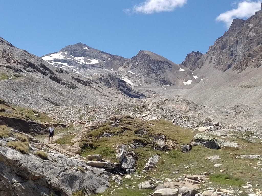 Tornati sul versante interno dell’altopiano, le asperità di addolciscono rapidamente e ci ritroviamo in una valle rocciosa, colma di detriti sassosi, rocce enormi levigate dalla forza del ghiacciaio mi fanno venire in mente ossa spolpate. Al centro serpeggia cristallina la Dora di Goletta che so essere nata poche centinaia di metri prima.