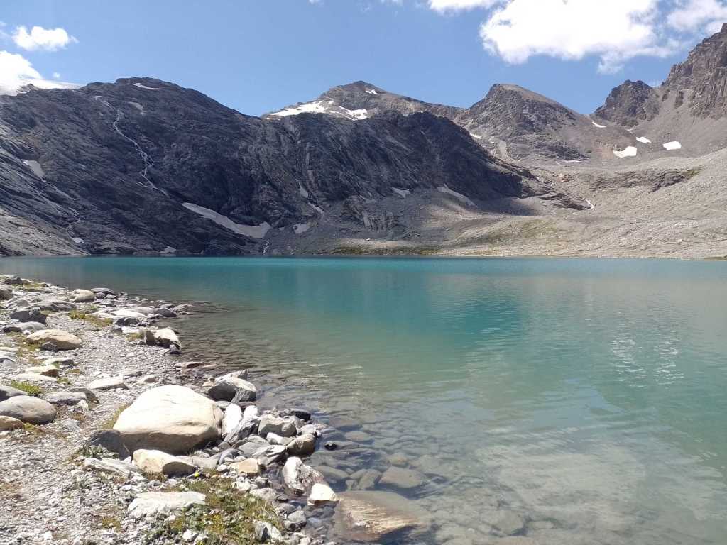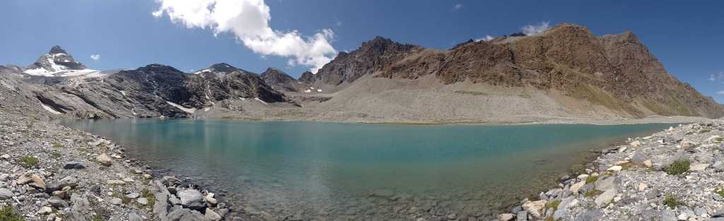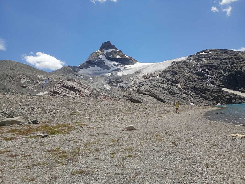 E infine eccolo, il Lago di Goletta. È difficile immaginare che possa esistere un luogo di tale bellezza. Alle acque turchine del lago fanno da cornice il Granta Parey e il Col di Goletta (3317 mt) e da lassù scende fin quasi al lago il Ghiacciaio di Golettaz. È uno scenario semplicemente inimmaginabile finché non lo si vede.