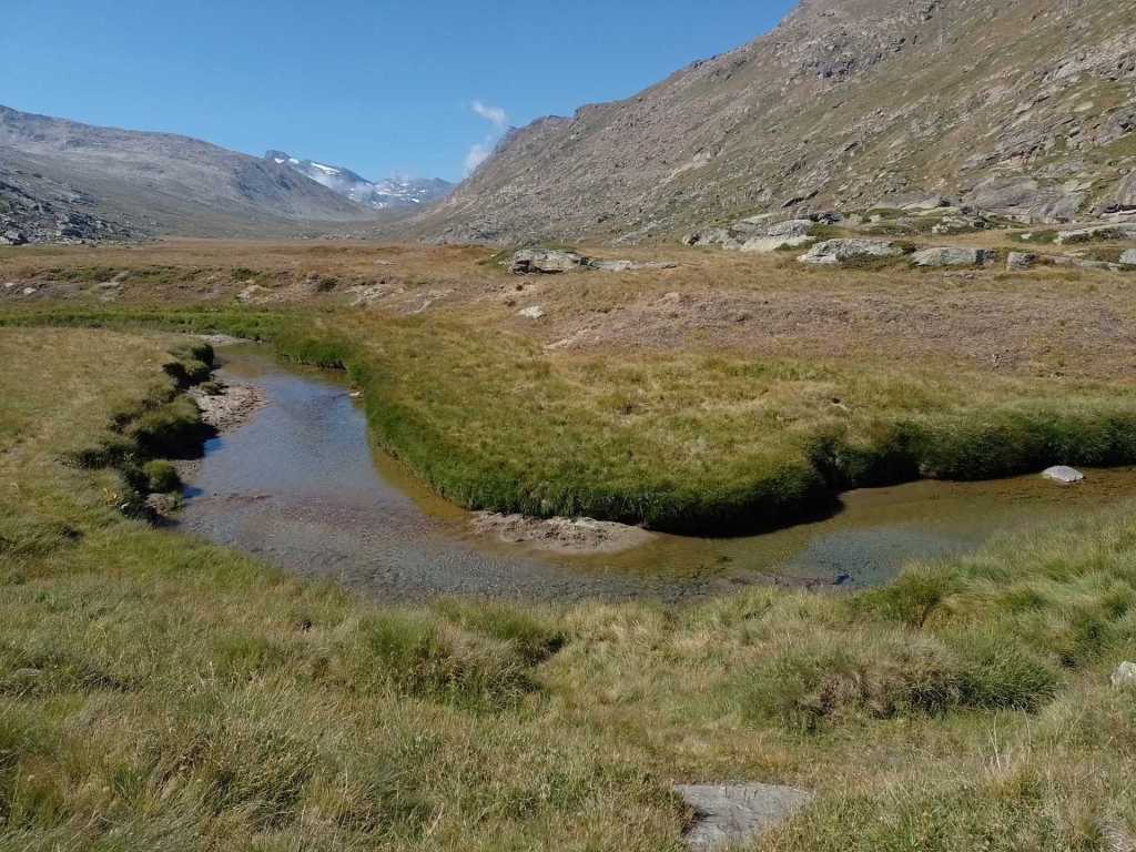 La valle svolta a sinistra e superato l’ultimo ostacolo, davanti a noi si apre a perdita d’occhio la maestosa Valle del Nivolet. Alla nostra sinistra si erge Cima della Roley (2996 mt) e poi in sequenza Monte Giansiana (3047 mt), Monte de Seyvaz (3074 mt), Punta Violetta (3031 mt) e sullo sfondo Punta Basei, il Grand Cocor e Cima d’Oin, con i loro ghiacciai. È uno scenario che non ci si aspetta. La parete destra è un susseguirsi frastagliato di cime più basse. A un terzo dell’altezza si nota una profonda cicatrice orizzontale, che taglia le montagne per tutta la loro altezza: è quanto rimane di un folle progetto stradale degli anni Settanta che avrebbe collegato il Piemonte alla Valle d’Aosta, passando dalla Valsavarenche per scendere nella Val di Rhêmes. Fortunatamente il progetto fu abbandonato; col tempo la Natura si riapproprierà di ciò che le appartiene. Purtroppo, già lo sappiamo, troveremo i Laghi affollati di auto e di turisti poiché il suddetto progetto non faceva che prolungare una strada inaugurata nel 1931 che arrampicava fin lassù. Oggi, fortunatamente, il numero di accessi giornalieri è limitato, ma pur sempre troppo.