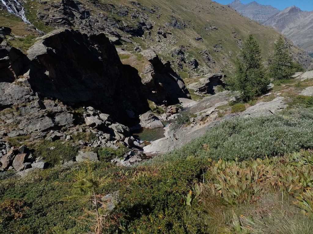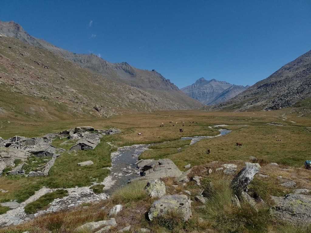 Superiamo due alpeggi abbandonati e in rovina: il Grand Collet e il Nivolet, il secondo circondato da mucche al pascolo. Superato poi un altro salto si vede laggiù, davanti a noi, l’ultima barriera, al di sopra della quale troveremo i Laghi.
