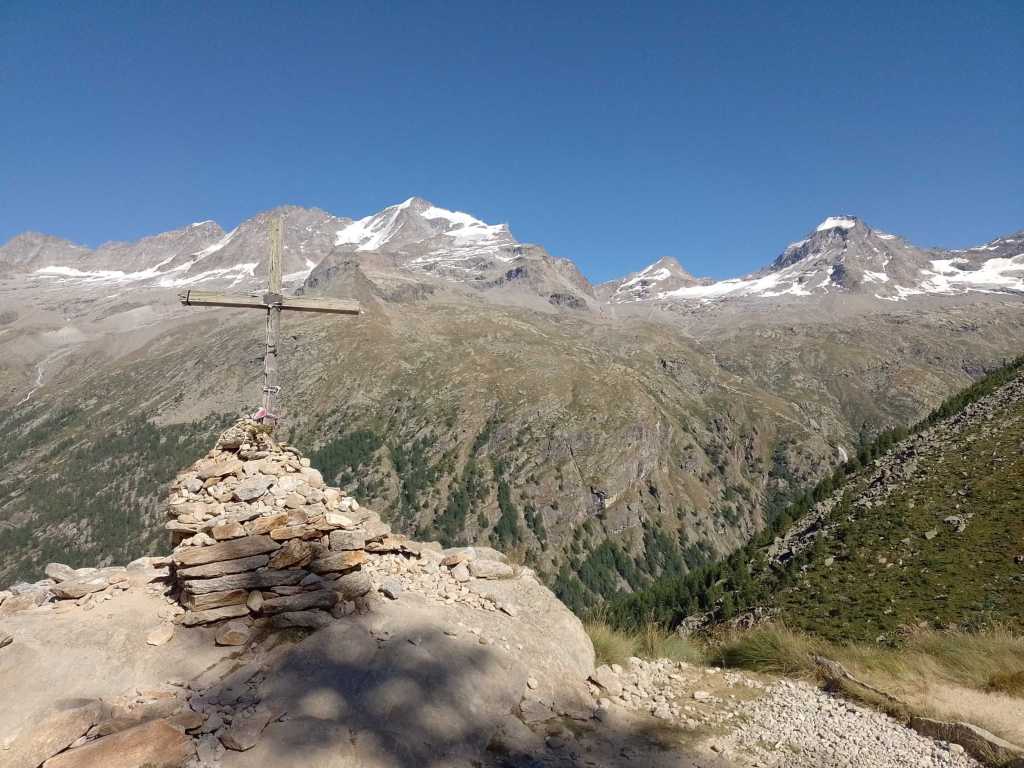 Dopo l’ennesima svolta e l’ennesima rampa da salire il sentiero improvvisamente si addolcisce e davanti a noi appare la Croce dell’Arrolley: in meno di due chilometri siamo saliti di oltre 350 metri. A dire il vero la salita non è ancora finita, ma il più è fatto e ci godiamo la vista del Gran Paradiso.