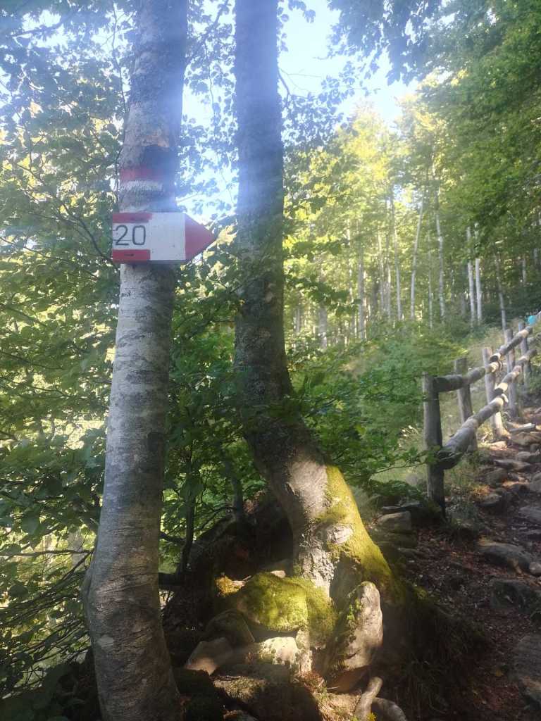 Arrivati a destinazione si parcheggia lungo la carreggiata, nei dintorni del rifugio, e si seguono le indicazioni del segnavia 520 (ovvero proseguiamo la medesima strada), che imbocchiamo verso ovest ma appena svoltata la prima curva pieghiamo a nord, lasciandoci dietro la carreggiata per una ripida salita in un bel bosco di faggi.