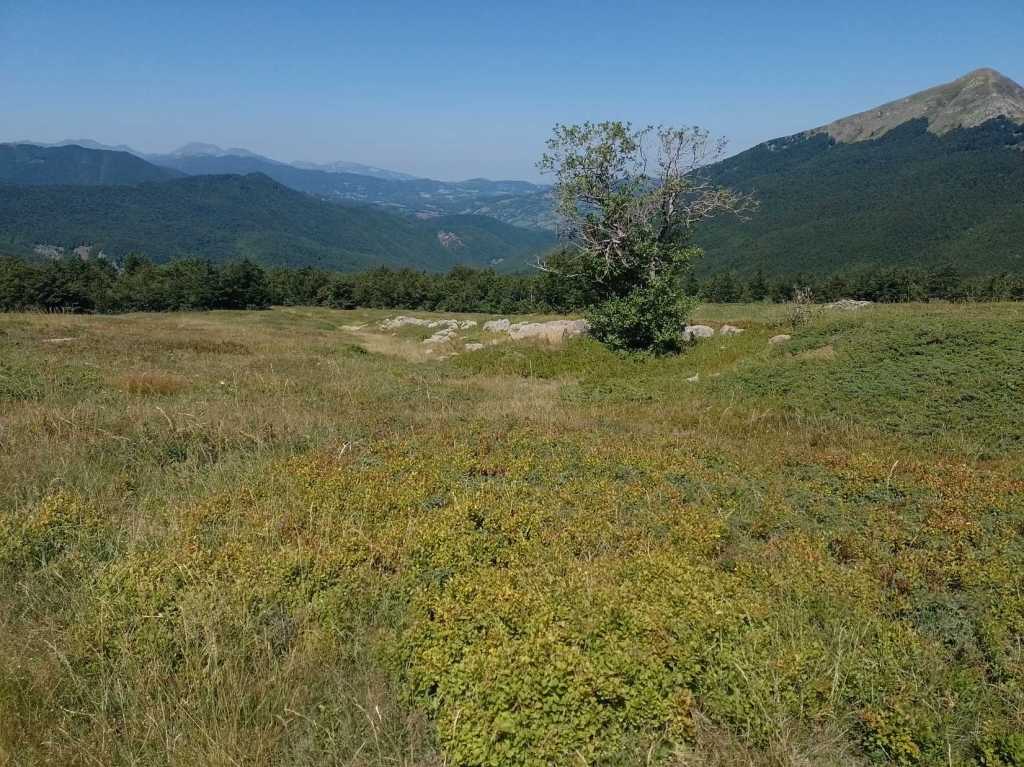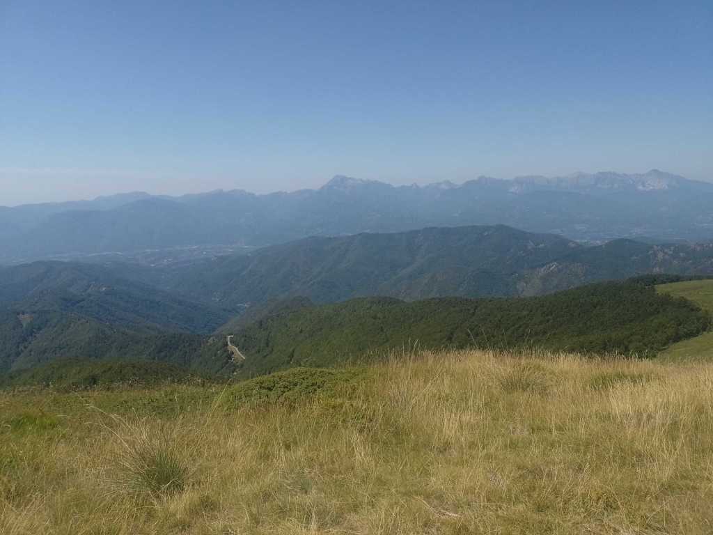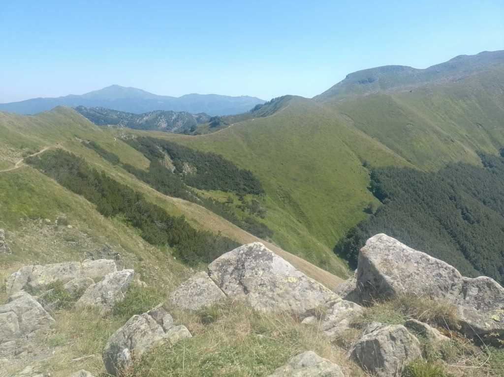Il sentiero prosegue col suo ritmo deciso fino all’uscita dal bosco quando addolcisce sensibilmente la salita, tagliando le ripide pendici di Cima dell’Omo (1859 m). Girando attorno a uno degli sproni della montagna si gode di un panorama straordinario. Peccato per noi che l’orizzonte più lontano fosse avvolto nella foschia grigia e bassa, ma non tanto da nascondere l’imperdibile spettacolo dell’intera catena delle Apuane e poi verso Lucca la sequenza dei Monti Pisani, le Pizzorne e poi sempre più su, fino alla nostra posizione. Continuando a volgere lo sguardo verso ovest, appare incombente il Colle Traversata (1826 m) e dietro di lui il Monte Giovo (1991 m). L’ultimo orizzonte, ormai verso nord, è chiuso dal Libro Aperto (1937 m) e infine dal Monte Cimone (2165 m).