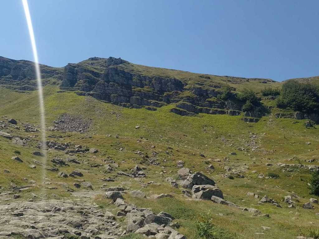Dal fondo dell’anfiteatro che attraversiamo, il manto di terra superficiale è stato in gran parte completamente asportato e così percorriamo una lastricatura obliqua di roccia, che segue la naturale inclinazione degli strati sovrapposti che costituiscono la montagna stessa. Davvero una sensazione e una vista molto particolare.